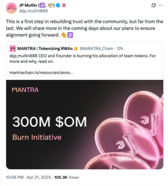 Two days after Mantra’s rapid 90% price collapse on April 13, Mullins posted to X that he intended to burn all of the staked tokens he was allocated at the blockchain’s mainnet genesis in October. These vested “team tokens” were due to be unlocked starting in 2027.