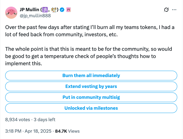 He also ran a poll on X about the proposed burn of his tokens, with alternate options such as extended vesting or unlocking tokens at milestones — as a “temperature check of people’s thoughts.”