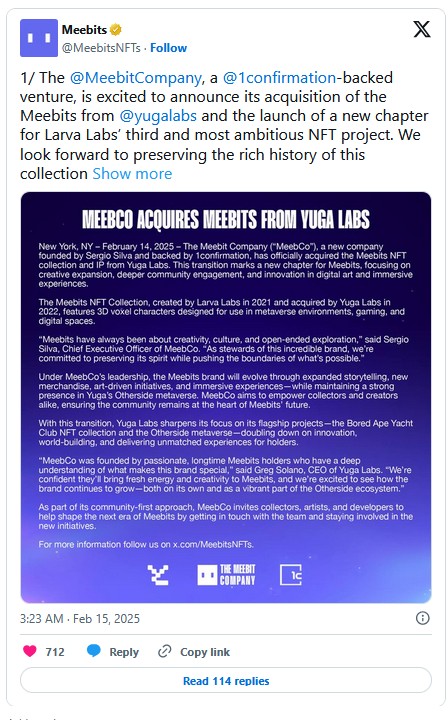 The announcement was overwhelmingly positively received, with many believing a dedicated steward of the Meebs makes more sense than Yuga Labs trying to juggle it among the already extensive amount of collections they have under their umbrella.
