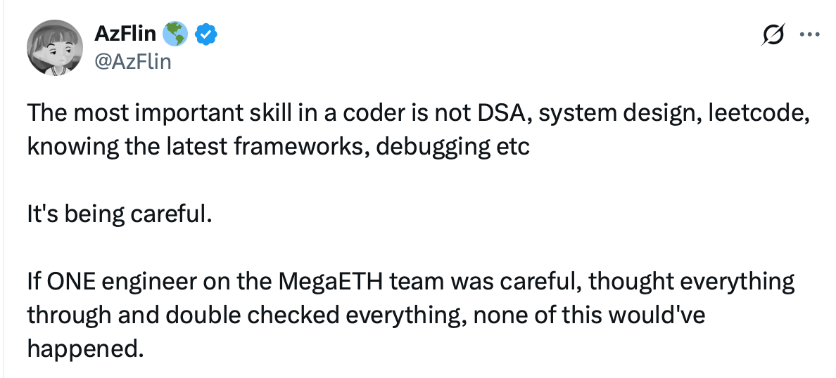 Some users praised MegaETH’s transparency in explaining what happened, but others were far more critical. AzFlin, a developer and DAO founder, argued that the mistakes could have been prevented if engineers had been more careful.