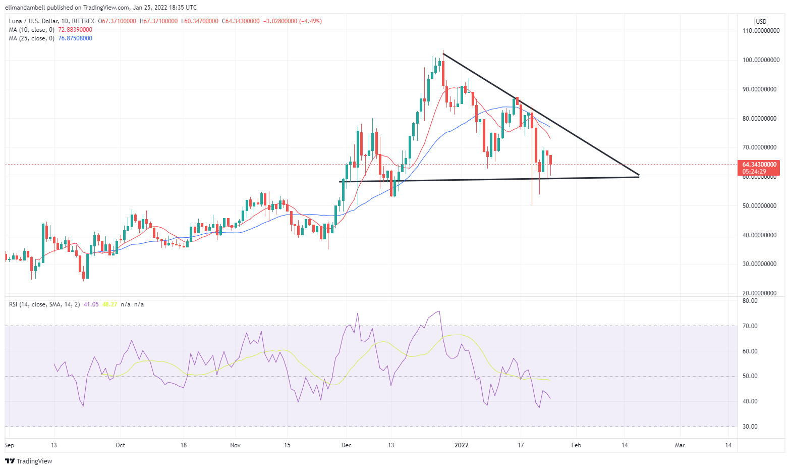 Looking at the chart, this luna has been trading in a streak of lower lows in recent weeks, which led to a breakout of its $59 floor last week.
