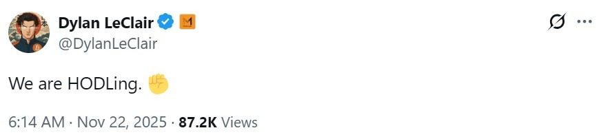 Despite this, the company continues to hold onto its BTC and accumulate more. Bitcoin strategy director Dylan LeClair said on X that the company is “HODLing.”