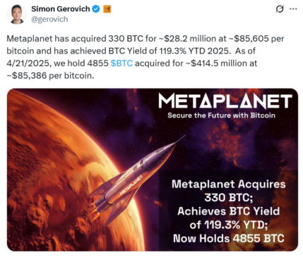 Metaplanet acquired 330 Bitcoin (BTC) for $28.2 million at an average price of $85,605 per BTC, bringing its total holdings to 4,855 Bitcoin worth $414 million, according to an April 21 post from Simon Gerovich, the CEO of Metaplanet.