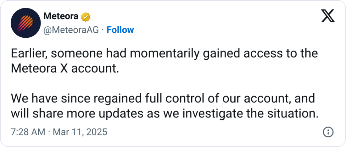 “It’s true that someone gained access momentarily to our Meteora X account. We’ve since reset the account and now verifying.”