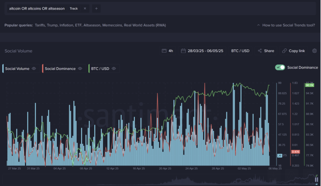Q explains that Santiment’s sentiment metrics are giving mixed signals on the market. One of those is retail traders on social media increasingly “calling for altcoins and mentioning altseason.”
