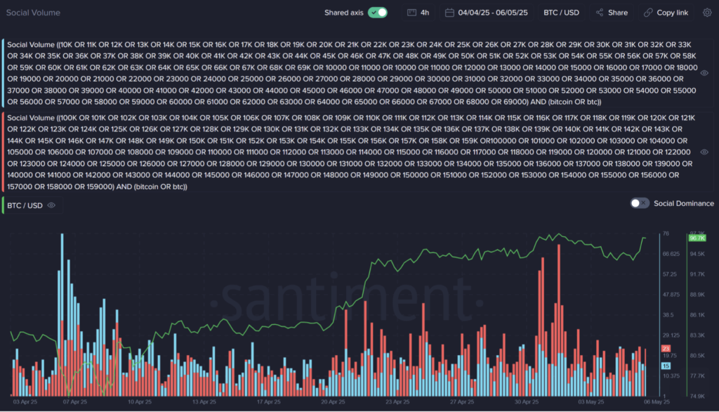 “We also are seeing a high level of high Bitcoin price predictions, as opposed to the low price predictions that were very prevalent when Bitcoin was buying out (and there was a perfect buy opportunity) from April 7 to 9 during maximum tariff fears,” Q says.