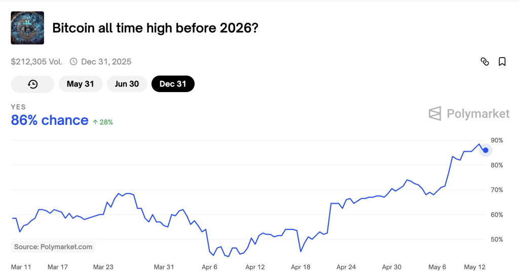 As we approach the middle of the year, confidence among punters on the crypto prediction platform Polymarket is high for Bitcoin surpassing its current all-time high of $109,000 by 2026, with odds sitting at 86%.