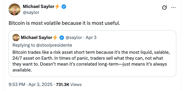 “Bitcoin is most volatile because it is most useful,” Saylor wrote in an X post on April 3, soon after BTC tumbled from the intra-week high of $87,100 on April 2 below $82,000, following the tariffs announcement by US President Donald Trump.