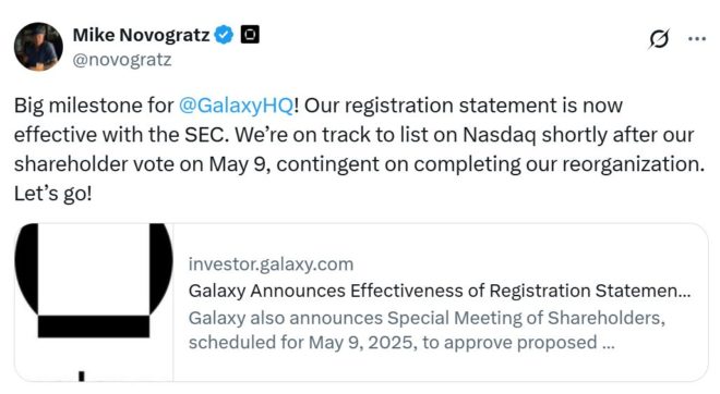 “Our registration statement is now effective with the SEC. We’re on track to list on the Nasdaq shortly after our shareholder vote on May 9, contingent on completing our reorganization. Let’s go!” Galaxy CEO Michael Novogratz said in an April 7 statement to X.
