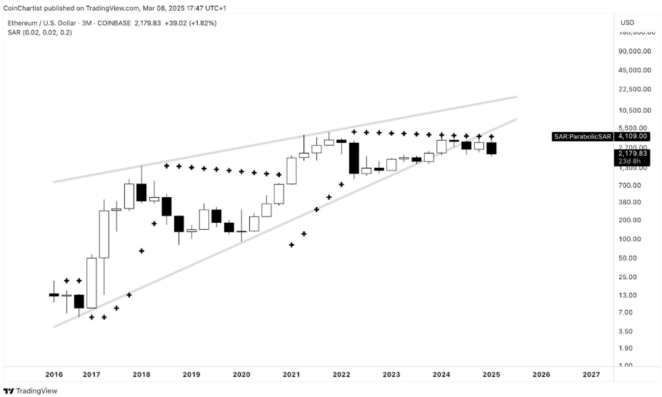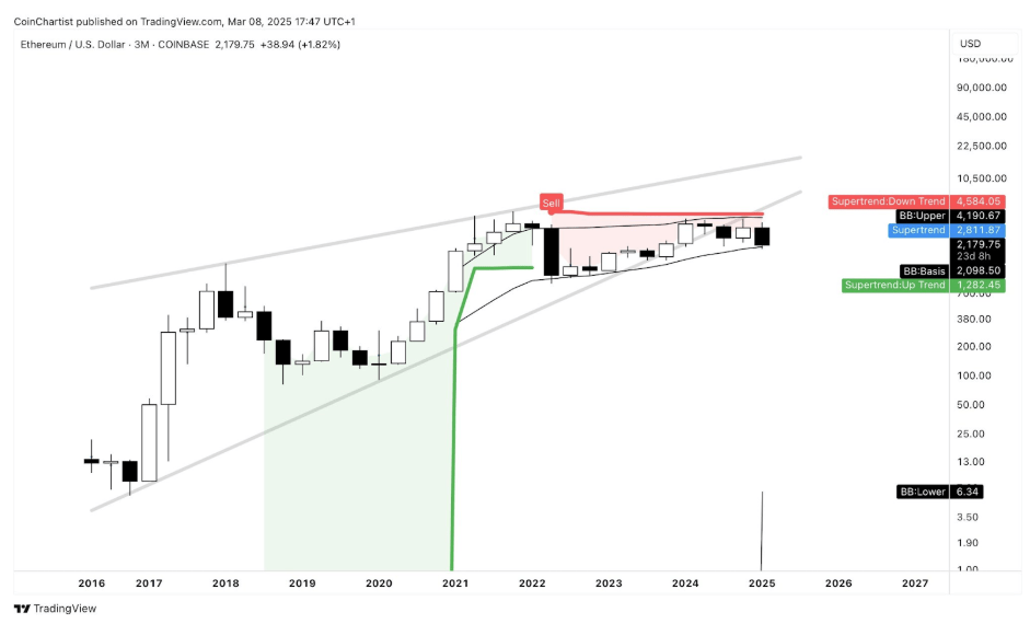 Currently, Ethereum is trading below $2,200, edging dangerously close to breaking below the crucial $2,100 threshold. A drop beneath this level is particularly concerning, not just because it signifies the loss of yet another psychological support but because technical indicators suggest that a monthly close below $2,100 could have severe consequences.
