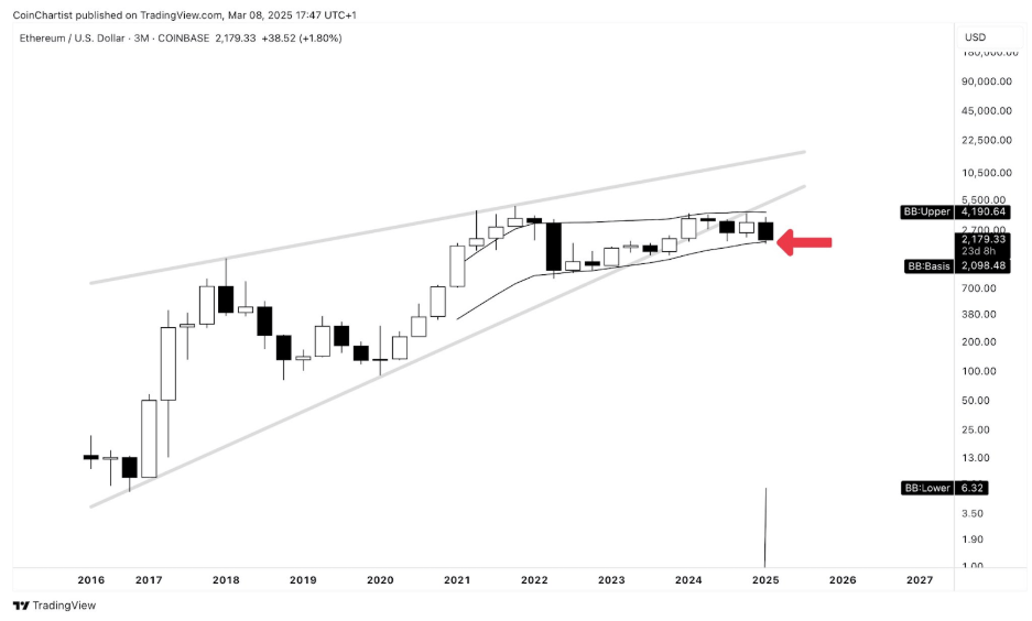 One of the most significant warning signs comes from the quarterly Bollinger Bands indicator, which has tracked Ethereum’s price action since February 2022. According to this indicator, Ethereum has remained within a defined range, with the upper Bollinger Band currently positioned at $4,190 and the lower band at $2,098. The worrying part is that a monthly close below $2,100 would effectively translate to breaking beneath the lower Bollinger Band and removing a long-standing support level.