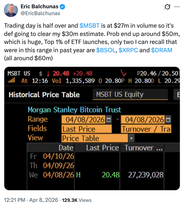 MSBT started trading on the NYSE Arca on Wednesday, generating $34 million in trading volume, slightly above the expectations of Bloomberg ETF analyst Eric Balchunas, who predicted first-day volume would reach $30 million.