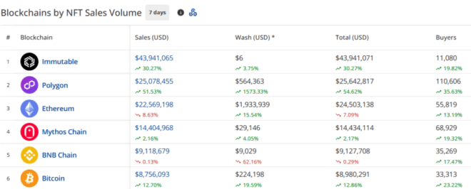 Immutable (IMX) has maintained its dominant position, with $43.9 million in sales, a 30.27% increase from the previous week. The blockchain’s wash trading remains negligible at just $6.