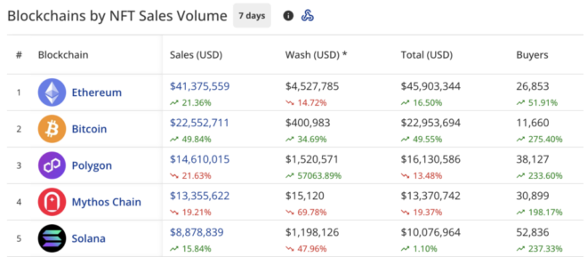 Ethereum remains the dominant blockchain for NFTs, with $41.3 million in sales, up 21.47% from the previous week. Ethereumโs wash trading has decreased by 14.85% to $4.5 million.