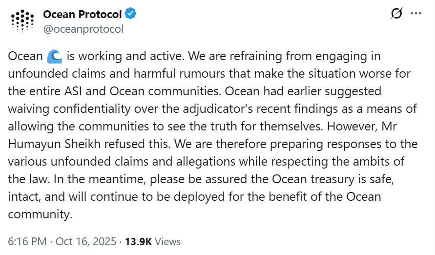 Ocean Protocol responded on X, denying the allegations outright and describing them as “unfounded claims and harmful rumors.”