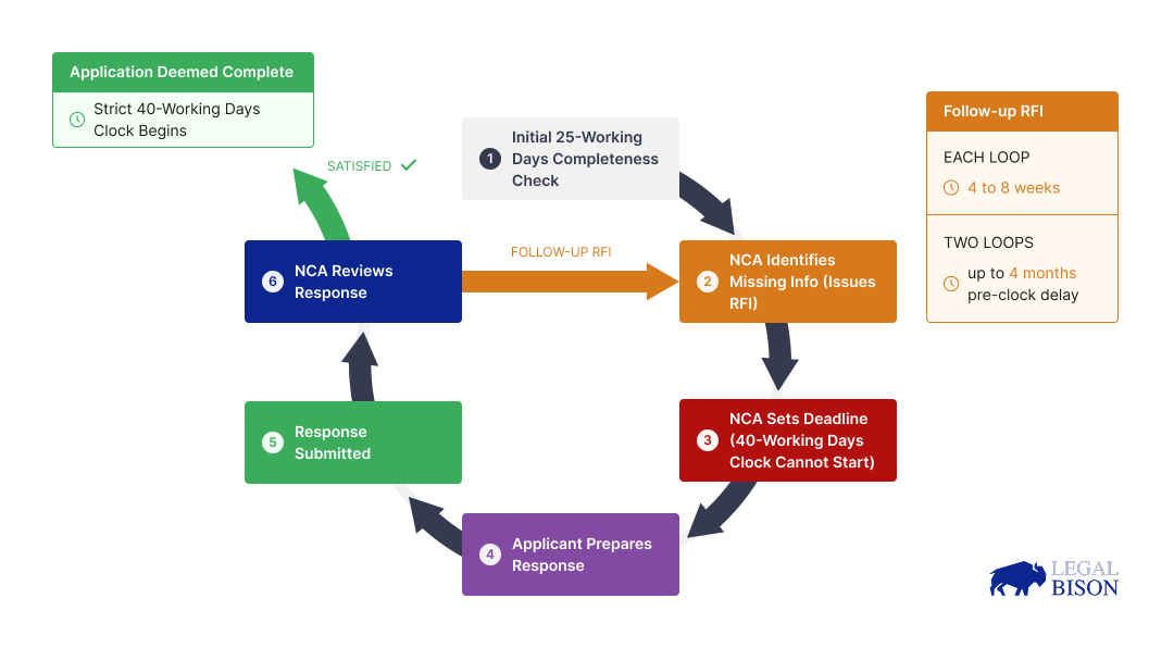 2. Submission is not the start line. The 40-working-day assessment period only begins after the NCA formally declares an application complete. The completeness check is a separate phase where the NCA has up to 25 working days just to review the initial submission. If information is missing, the NCA sets a strict deadline for the applicant to provide the missing details, and may refuse to review the application entirely if that deadline is missed.
