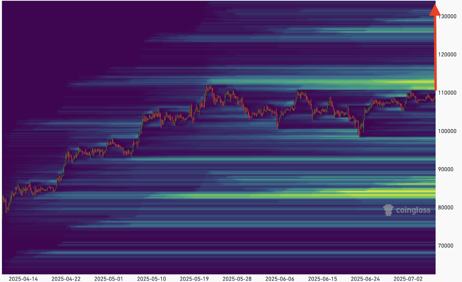 The BTC/USDT three-month liquidation heatmap shows the big liquidity clusters sitting just above $110,000, per data from CoinGlass. Heavy ask orders are also sitting around $122,000 up to $130,000.