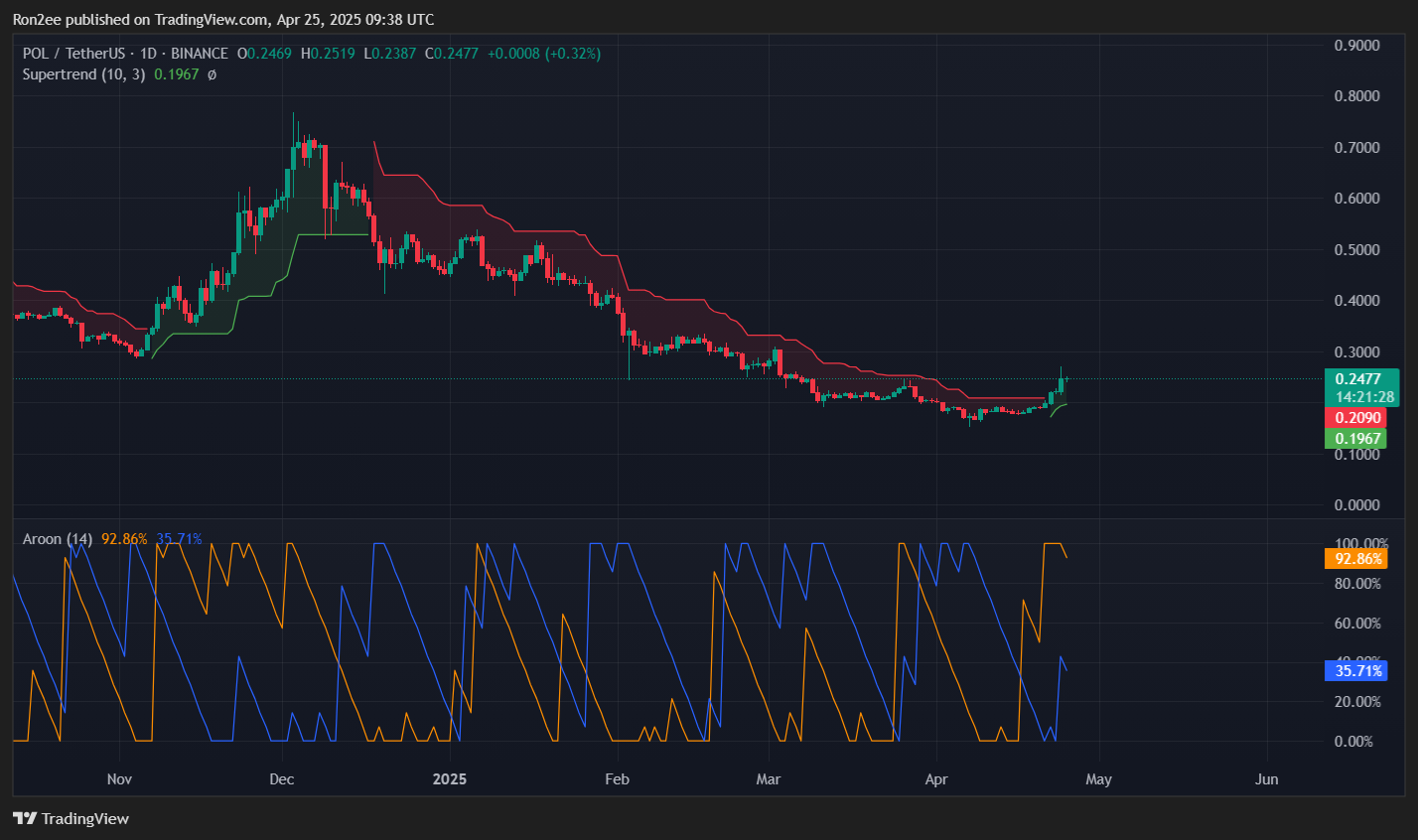 It also formed a golden cross on the daily timeframe, with the 9-day EMA moving above the 20-day EMA for the first time since November 2024. Back then, this signal flashed just before POL went on a 112% rally within a month, climbing from $0.34 to $0.71. If history repeats, a similar upside move could be on the cards.