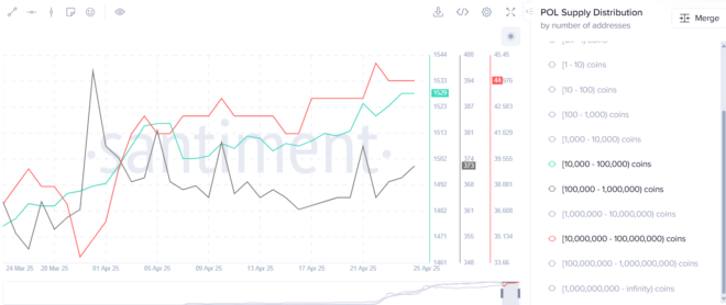 The rising bullish sentiment among its investors is also evident in a steady increase in the number of wallets holding between 10,000 and 100 million POL tokens. That suggests whales and mid-sized holders are accumulating, possibly expecting more upside.