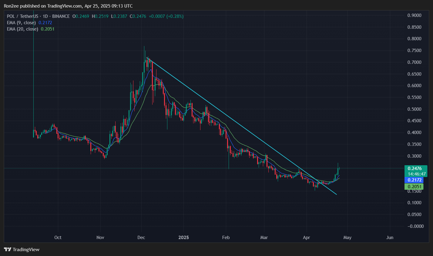 On the daily chart, POL has broken out above the upper trendline of a long-term descending pattern that began in December 2023. This kind of breakout often signals the start of a trend reversal, and the momentum looks strong.
