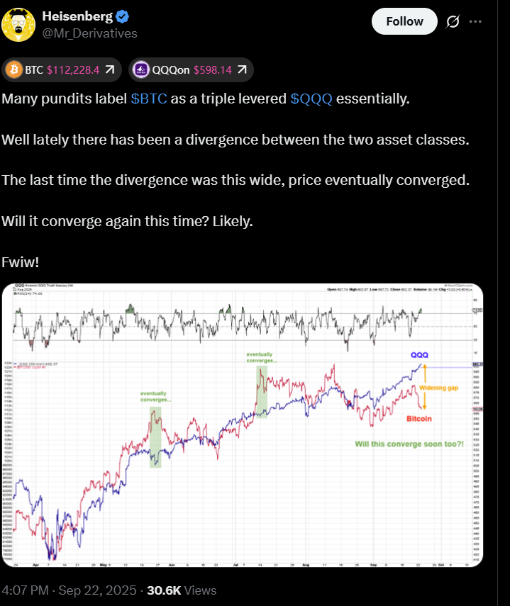 Analyst Heisenberg added that Bitcoin’s wide divergence from the Nasdaq will likely converge again, citing historical trends — a signal that BTC could rebound swiftly in line with the Nasdaq’s recent all-time high.