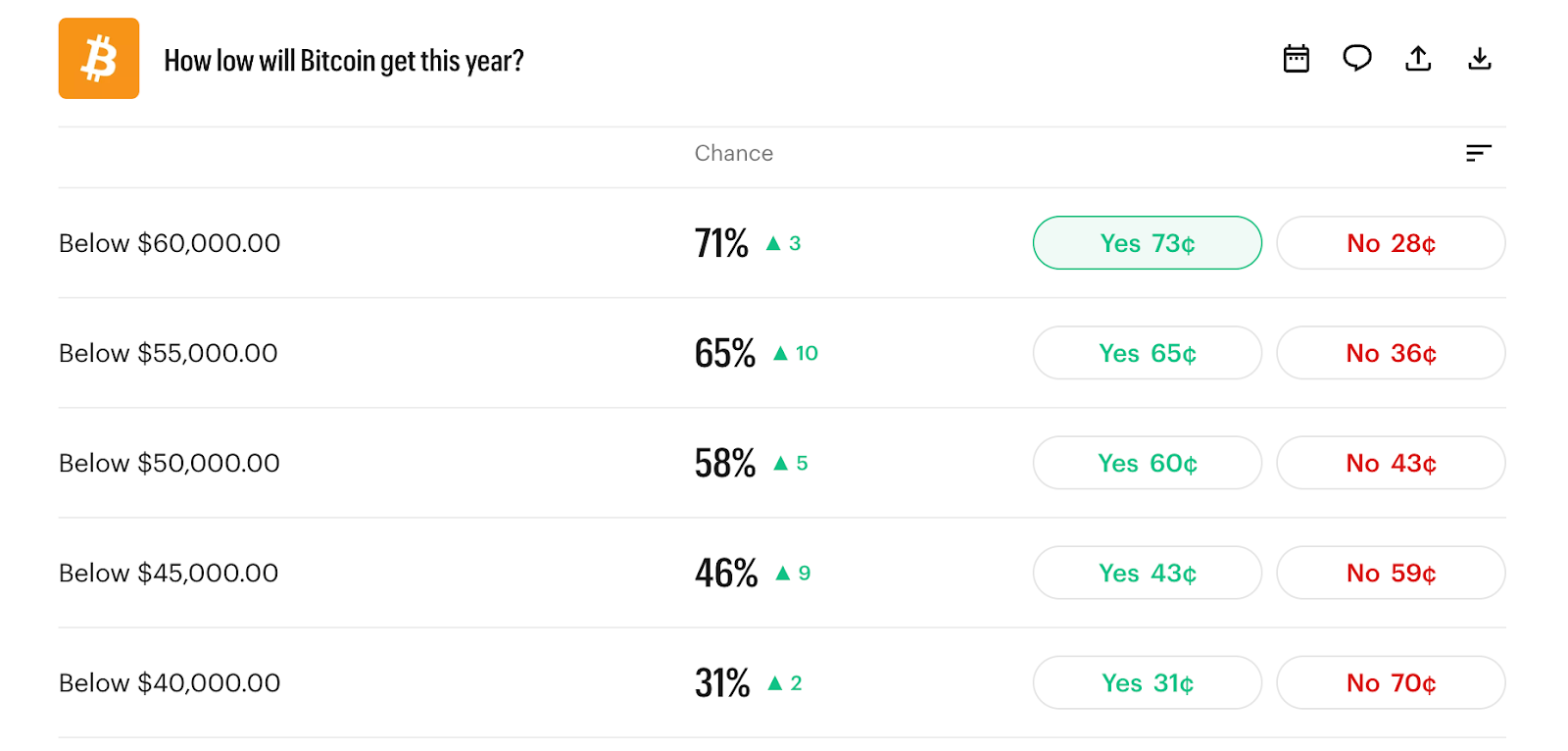 The lower price target forecasts for BTC mimic those elsewhere. On fellow prediction site Kalshi, traders set 71% odds of Bitcoin dropping below $60,000, with a 65% chance that it drops below $55,000. The lowest price target on Kalshi is $40,000, with a 31% possibility that BTC drops to this level before Dec. 31.
