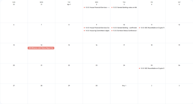 - 17:00 UTC (1:00 p.m. ET) The U.S. Securities and Exchange Commission will hold the latest of its crypto roundtables, this time focusing on custody issues.