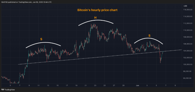 In other words, BTC is not out of the woods yet, and prices could turn lower from around $104,000, extending the pullback. The immediate support is at $100,000, followed by $95,500. The latter is arrived at by subtracting the height of the H&S pattern from the breakdown point.