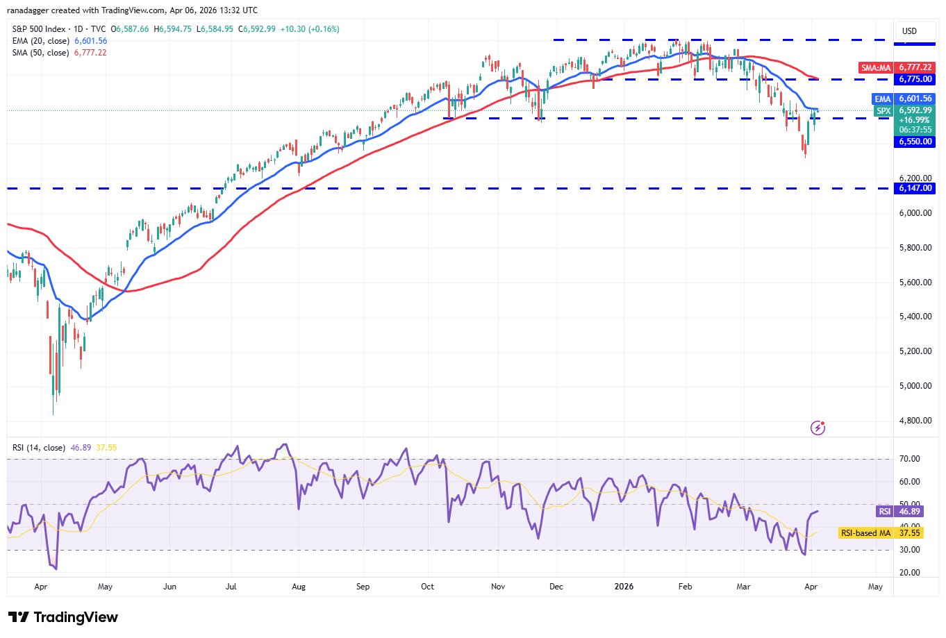 The S&P 500 Index (SPX) has pulled back to the 20-day exponential moving average (6,601), indicating solid buying at lower levels.