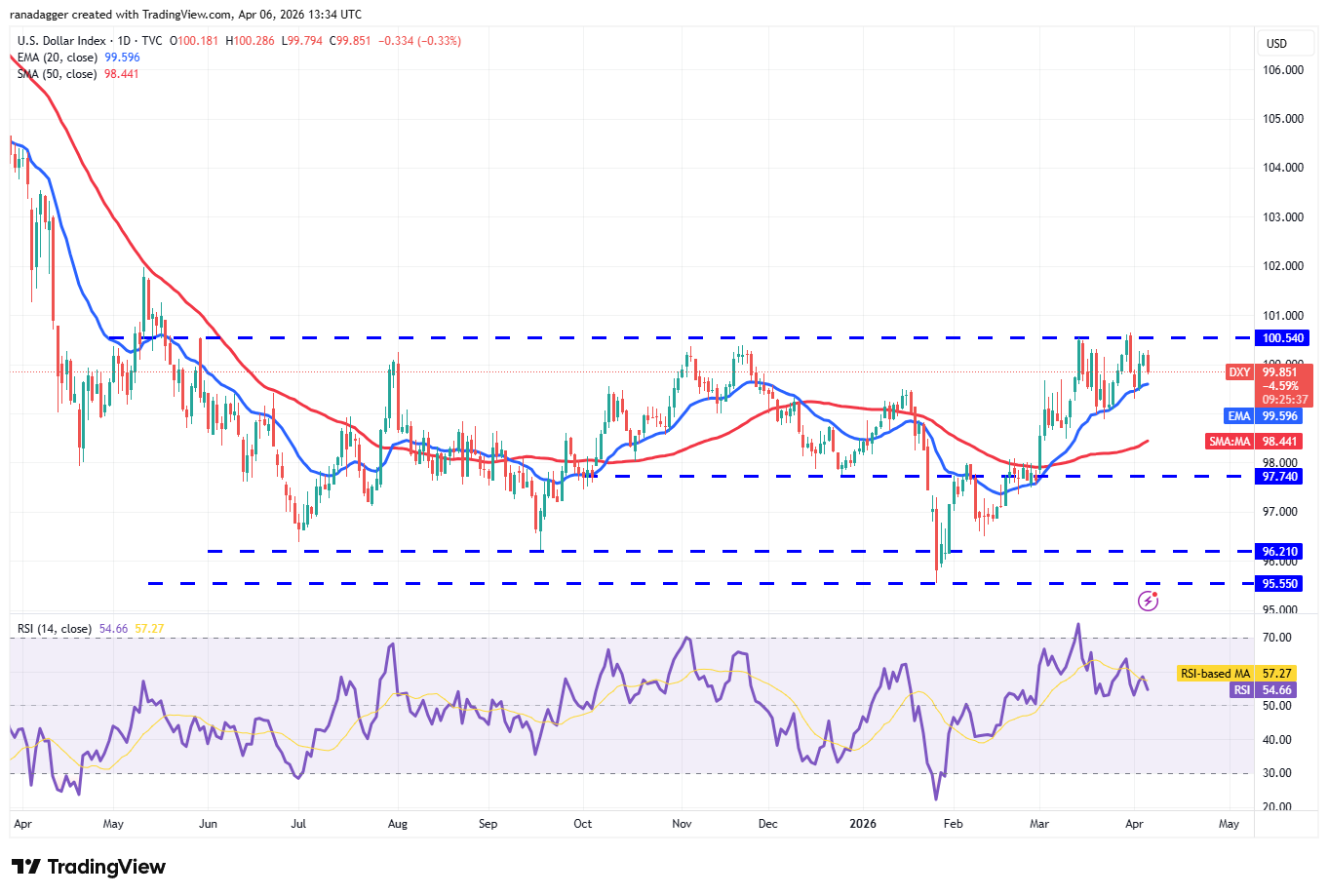 The US Dollar Index (DXY) is stuck between the 20-day EMA ($99.59) and the 100.54 overhead resistance.
