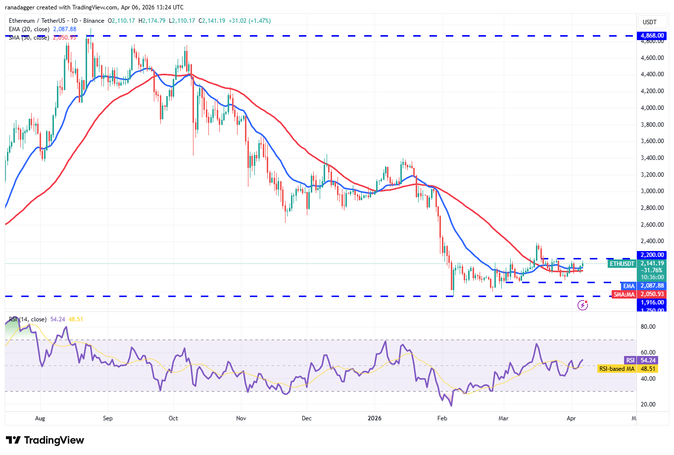 Ether (ETH) closed above the moving averages on Sunday, clearing the path for a rally to the $2,200 resistance.