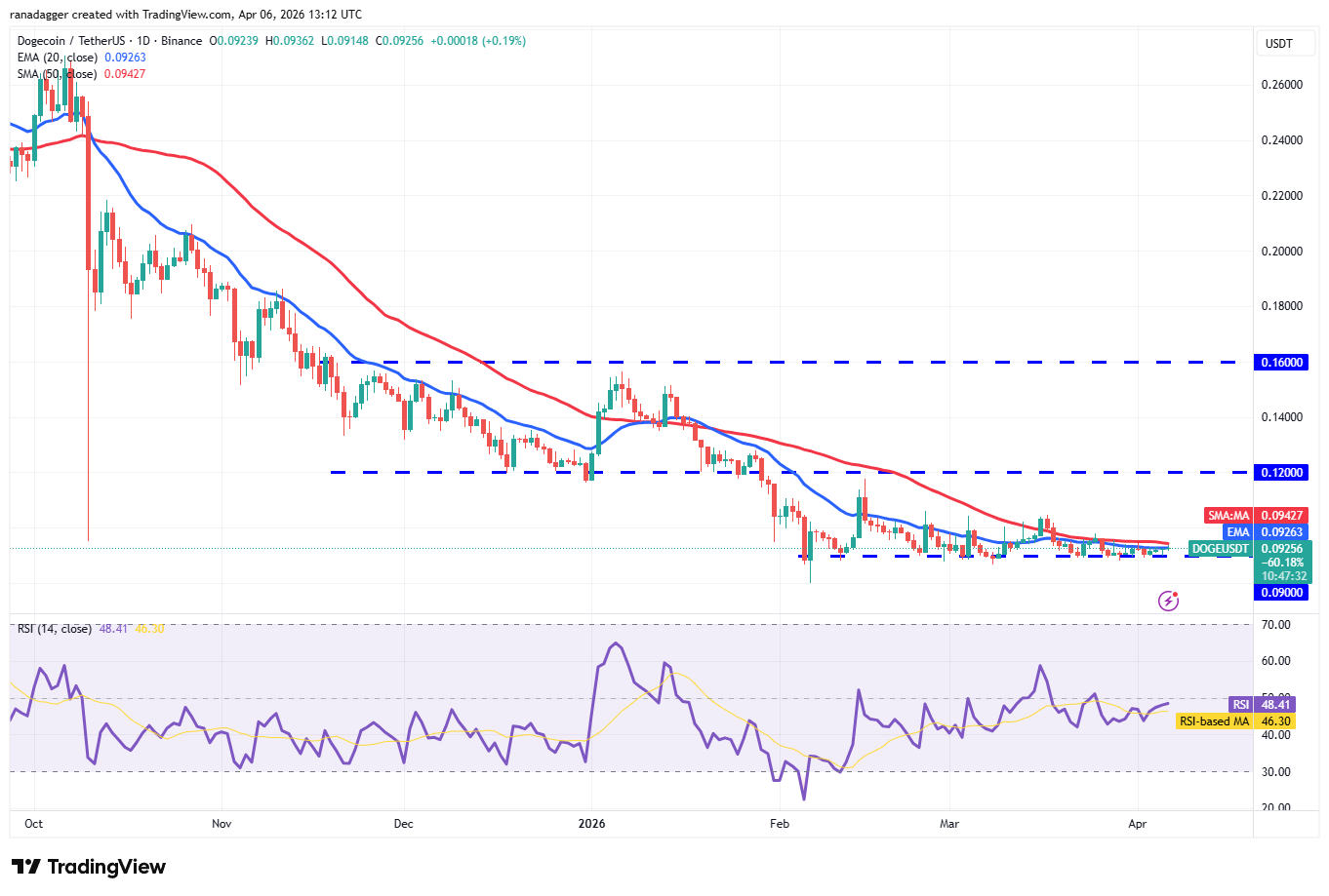 Dogecoin (DOGE) remains stuck inside a tight range between the 50-day SMA ($0.09) and the $0.09 level, signaling a balance between supply and demand.