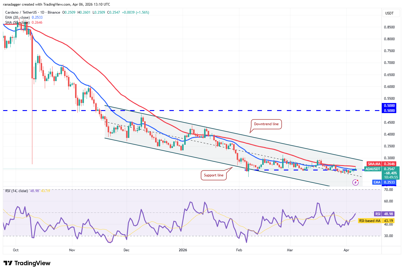 There is resistance at the 50-day SMA ($0.26), but if the bulls overcome it, the ADA/USDT pair may reach the downtrend line of the descending channel pattern. Sellers are expected to defend the downtrend line, as a close above it signals a potential short-term trend change.