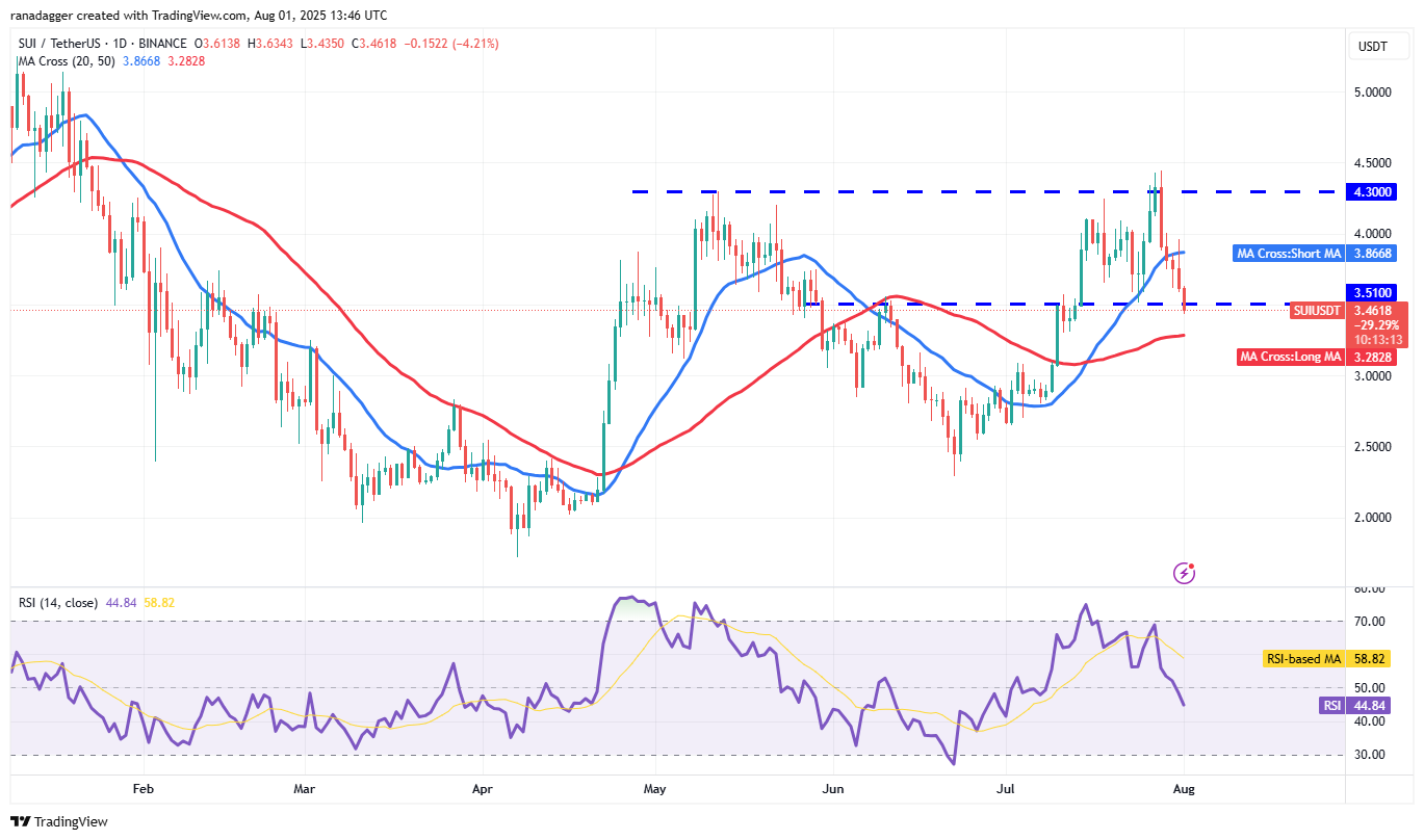 The bears are trying to strengthen their position by maintaining the price below $3.51. If they manage to do that, the SUI/USDT pair could drop to the 50-day SMA ($3.28).ย