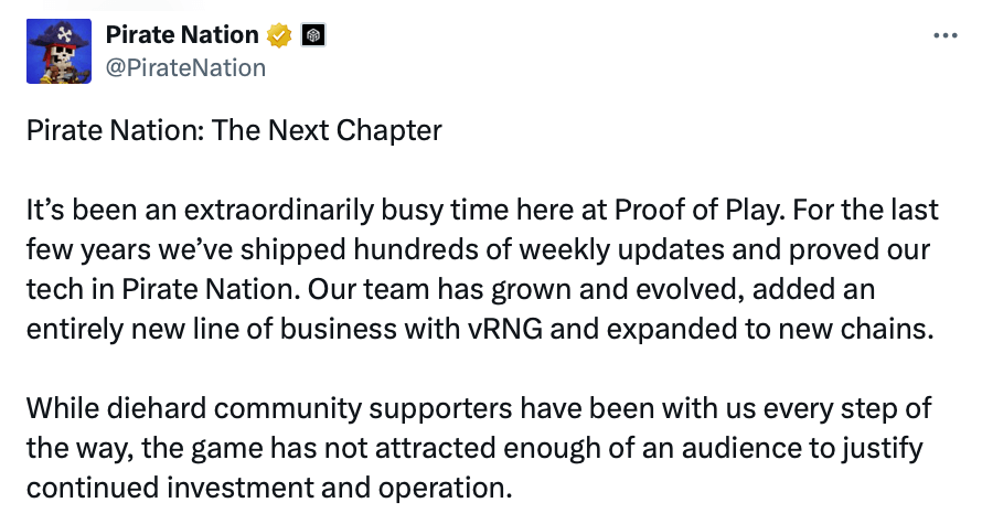 “The demand for the fully onchain version of Pirate Nation simply isn’t there to sustain operation indefinitely,” it said again, just to hammer down the point.