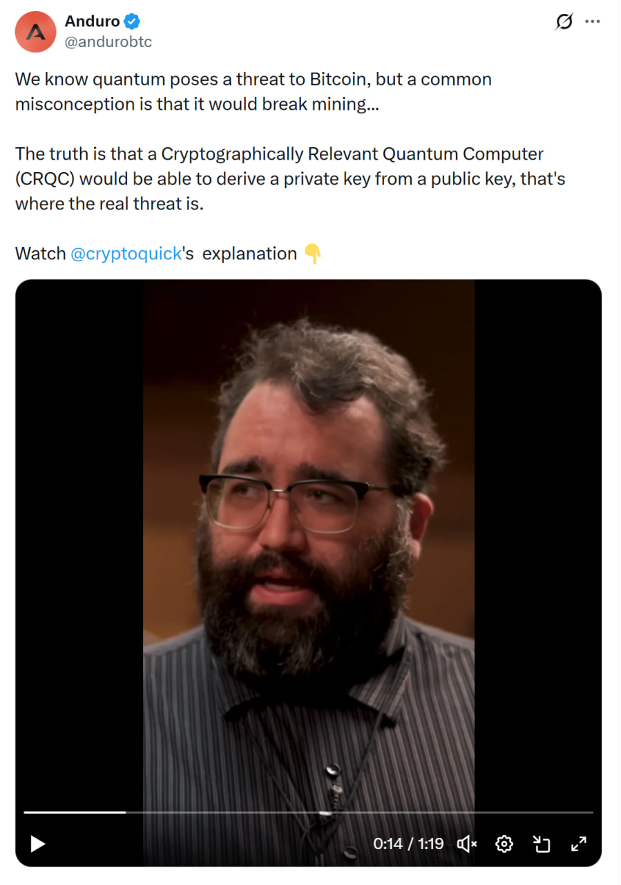 Nic Puckrin, crypto analyst and co-founder of Coin Bureau, was more blunt. “The whole ‘quantum threat to Bitcoin’ narrative is 90% marketing and 10% imminent threat… we’re almost certainly at least a decade away from computers that can actually break existing cryptography,” he said.
