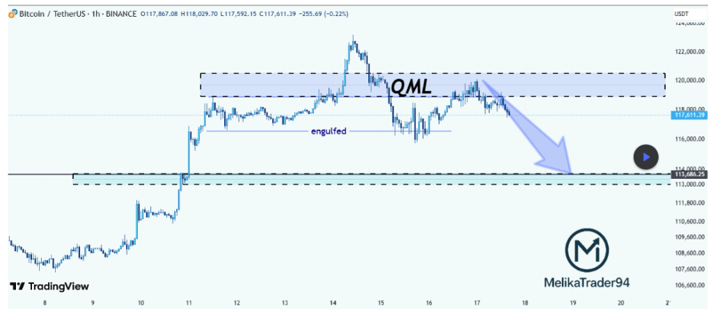 According to the hourly candlestick chart shared by Melikatrader94, Bitcoin is currently exhibiting a Quasimodo Level (QML) structure. The Quasimodo Level (QML) structure is characterized by three peaks in a bearish scenario or three troughs in a bullish scenario, with the middle one being the most prominent, identifying the price. The post predicted that Bitcoinโs entry into the $119,000โ$121,000 zone would draw sellers, and this was indeed the case.ย