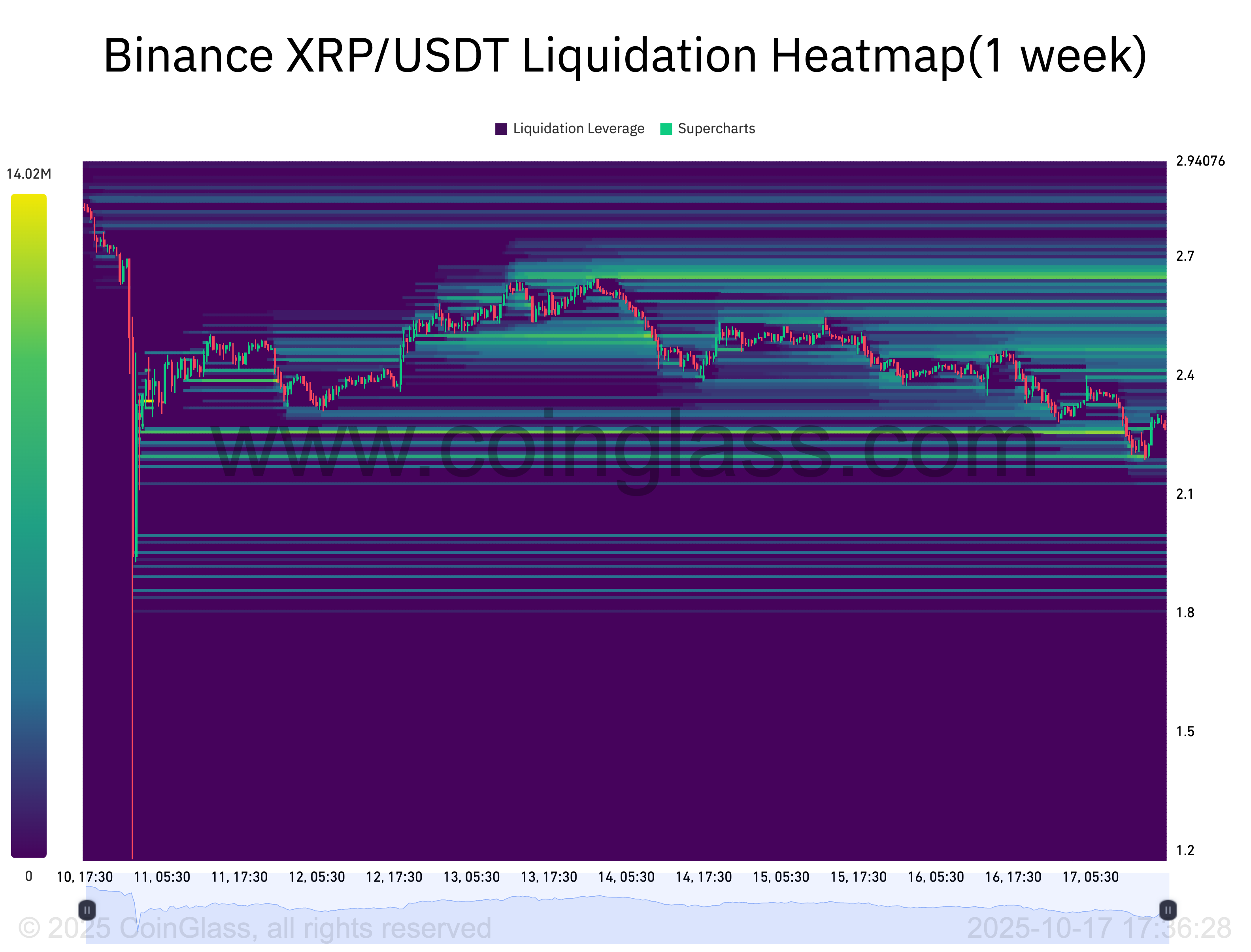 Looking broadly, XRP has been fluctuating within a falling wedge pattern after last week’s crypto market rout, which liquidated a record $20 billion or more in positions.