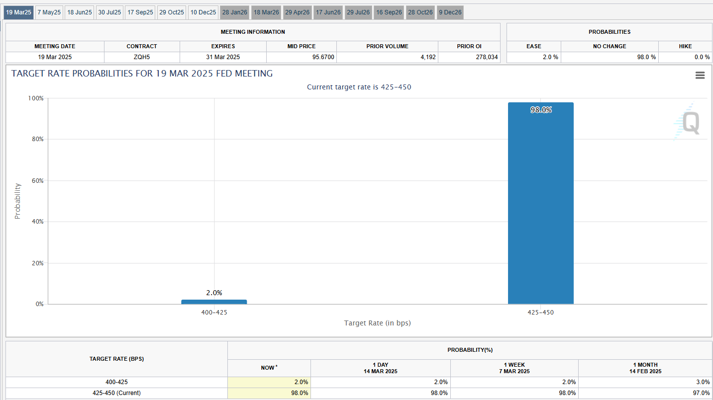 The predictions come days ahead of the next FOMC meeting scheduled for March 19. Markets are currently pricing in a 98% chance that the Fed will keep interest rates steady, according to the latest estimates of the CME Group’s FedWatch tool.