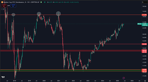 In an X post, Daan Crypto stated that the Bitcoin Dominance shows no signs of stopping following the latest surge above 64%. He indicated that the dominance will only continue to rise as more treasury companies try to accumulate Bitcoin. Meanwhile, on the other hand, hopes of an altcoin season fade away as many altcoins are plagued with big unlocks and downtrending momentum.