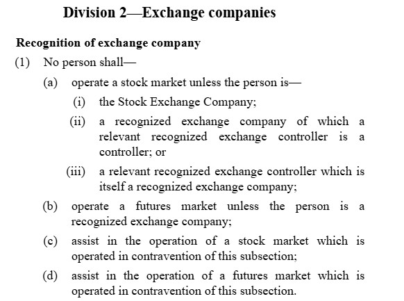 Chu: Under Section 19 of the Securities and Futures Ordinance (SFO) here in Hong Kong, it’s actually written into the law that the Stock Exchange of Hong Kong (HKEX) — which is a limited company — is the only entity that can deal with Hong Kong corporate shares.