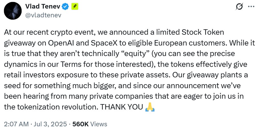 Robinhood knew the risks. When they launched the tokenized shares, they said these are just synthetic representations. But if they’re profiting and using others’ trademarks, it opens the door to legal issues — not just securities law, but trademark infringement and broader compliance violations.