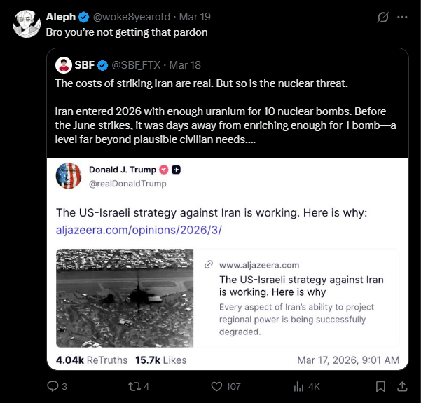 On March 18, Bankman-Fried wrote a post through legal proxies, supporting Trump’s decision to bomb Iran. Polymarket odds show the chance of a US/Iran ceasefire by year’s end at 78%, some 68 points higher than a pardon for Bankman-Fried.