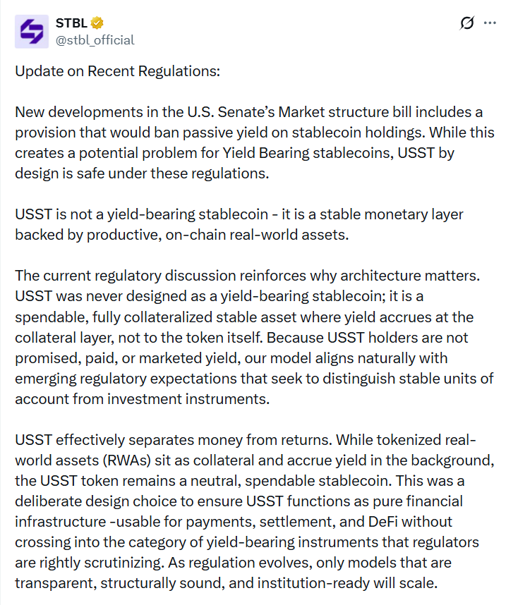 While the underlying RWAs are accruing the yield in the background, the new stablecoin framework seeks to separate the stablecoin from returns, to avoid the recent regulatory scrutiny on yield-bearing stablecoins, wrote STBL in an X post on Jan. 14.