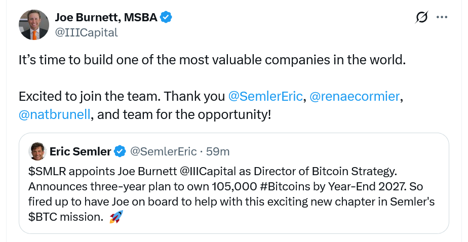 Semler said that it hired Bitcoin researcher Joe Burnett as its “director of Bitcoin strategy” to lead its Bitcoin-buying plan.