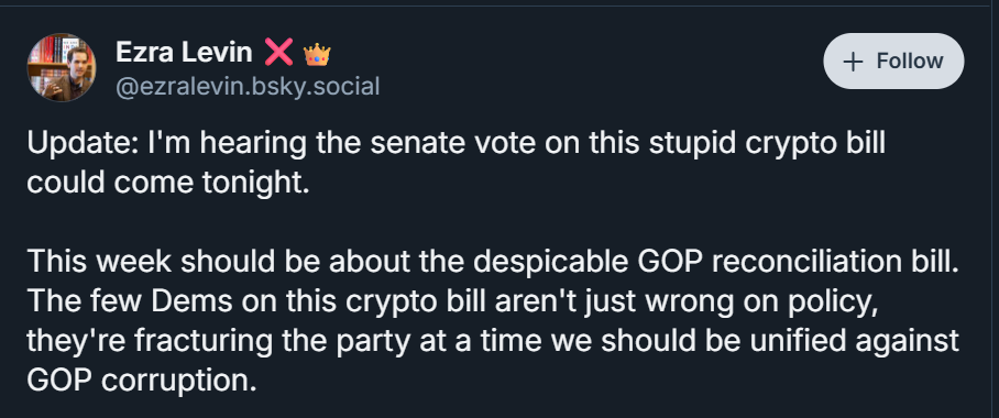 Some activists have said that the Democrats supporting the bill should be ousted in the upcoming Democratic primaries in 2026, reflecting a growing rift in the Democratic Party over cryptocurrencies.