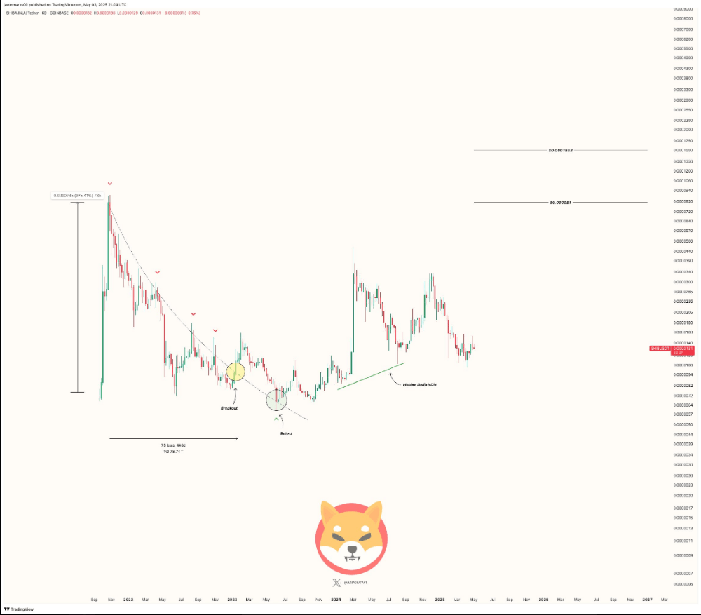 Technical analyst Javon Marks reaffirms his earlier projection that Shiba Inu will most probably reach $0.000081 during the current cycle in the market. This goal is up 500% from the current price. Marks mentions SHIB’s bull run to $0.000033 in December 2024. Then, the price drops back to $0.000010, which according to the analyst, is “expected” and part of a healthy correction process.