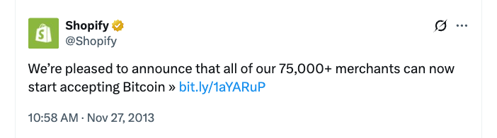 Shopify has been indirectly supporting Bitcoin (BTC) payments through gateway integrations since at least 2013, when the company officially announced that all of its 75,000 merchants were free to start accepting Bitcoin.