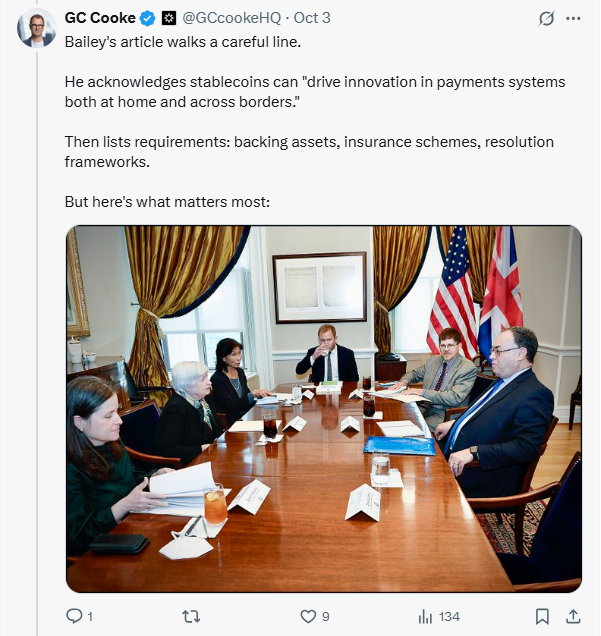 GC Cooke, a co-founder of UK-based stablecoin management platform Brava Finance, said that BoE governor Andrew Bailey is warming to the idea of stablecoins existing alongside central bank-controlled assets like central bank digital currencies.ย