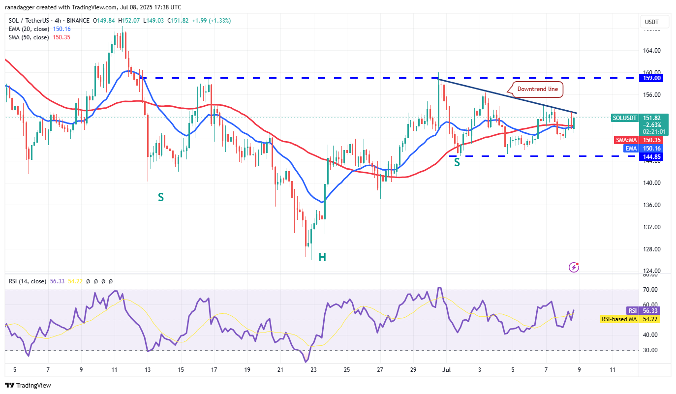 Solana turned down from the 50-day simple moving average ($154) on Monday, indicating that the bears are fiercely defending the level.